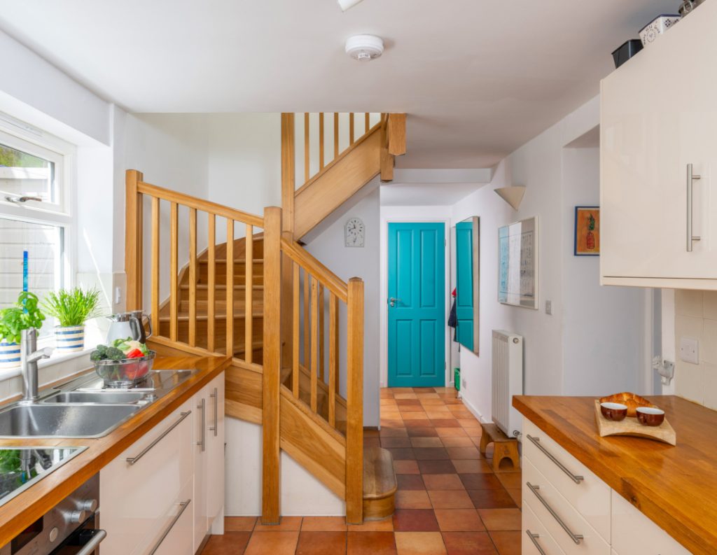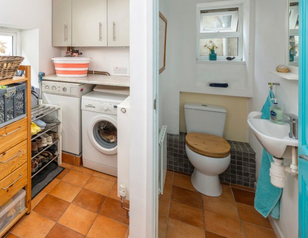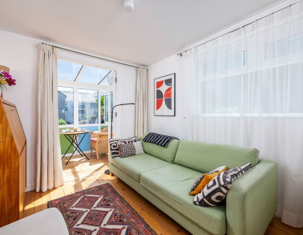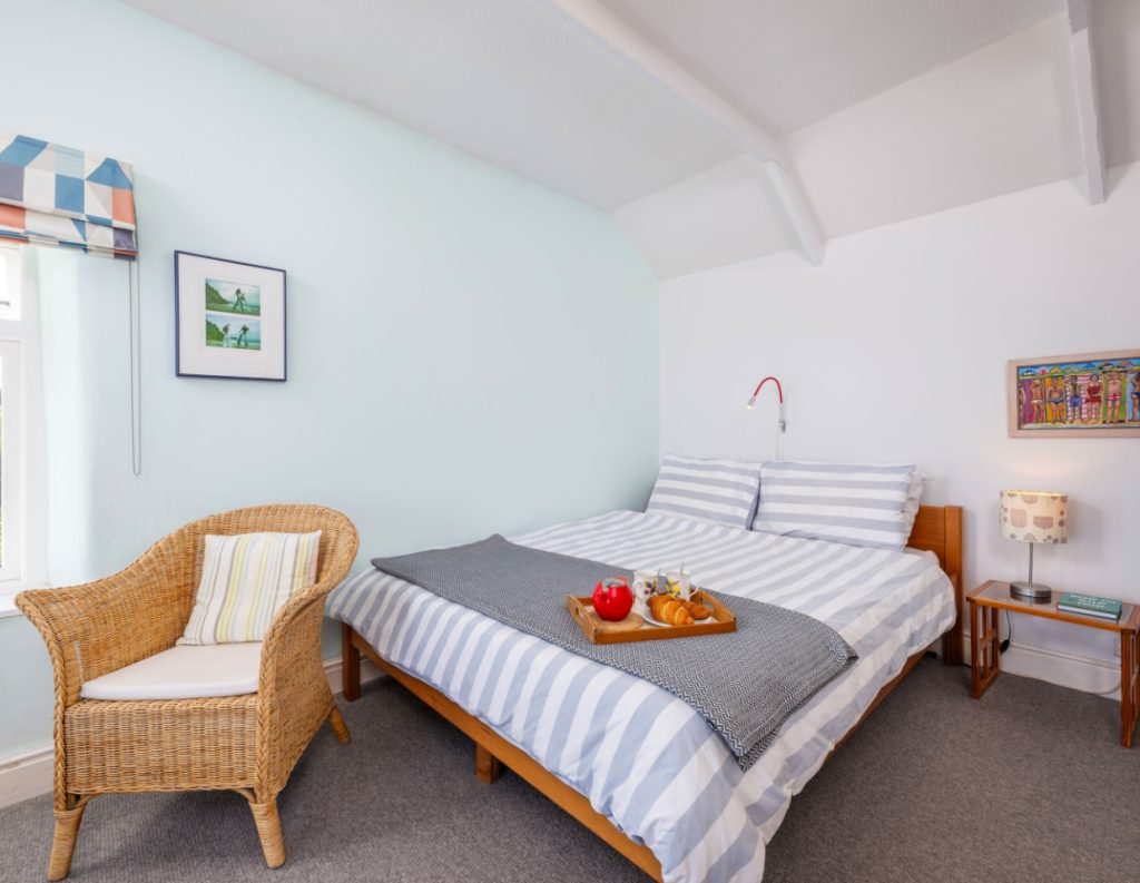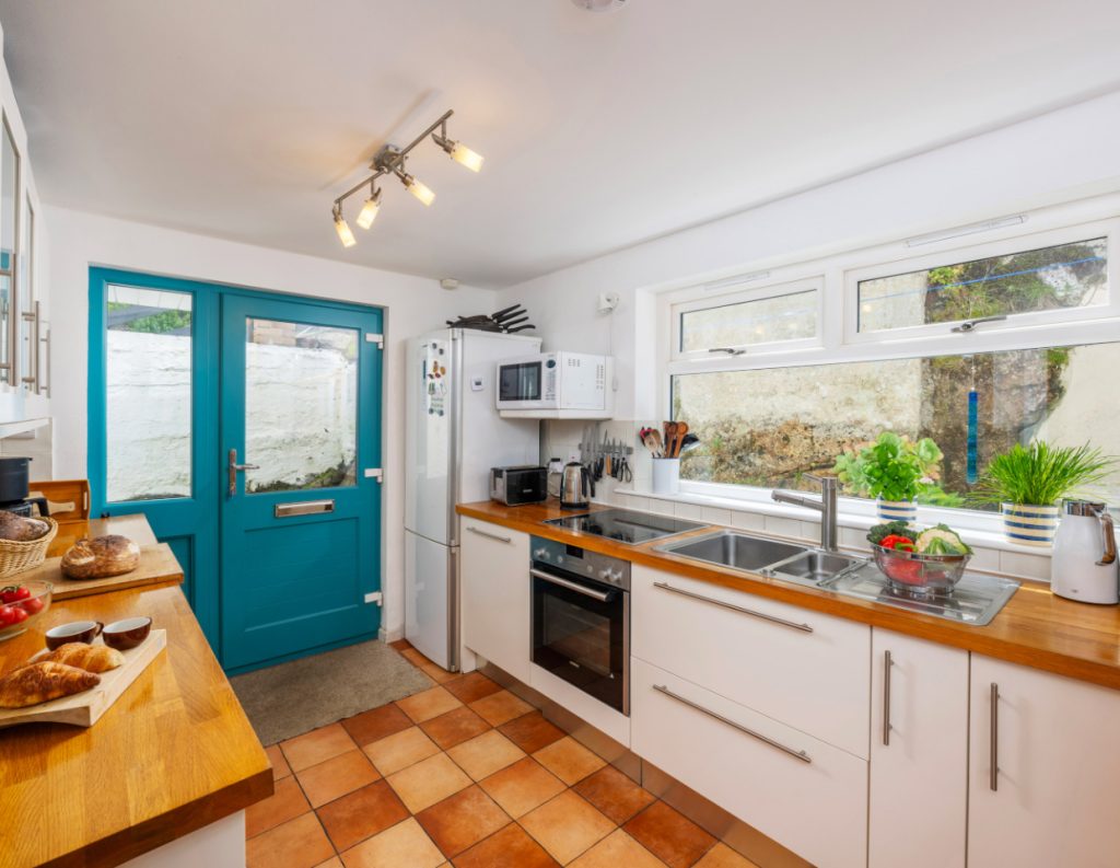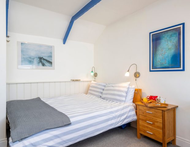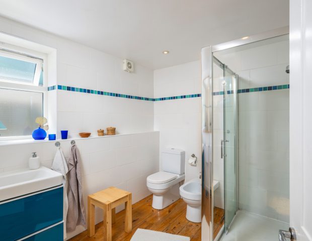 The house sleeps 5 with one master bedroom 9160cm bed) and then a second double (140cm bed) for another couple or one single and a third room which doubles up as a snug or has a extendable sofa bed to accommodate a fifth guest. This space also has a lovely glass seating area which is a real sun trap and peeps down towards the beach below. There is one family bathroom upstairs with walk in shower and a secondary toilet and basin downstairs.