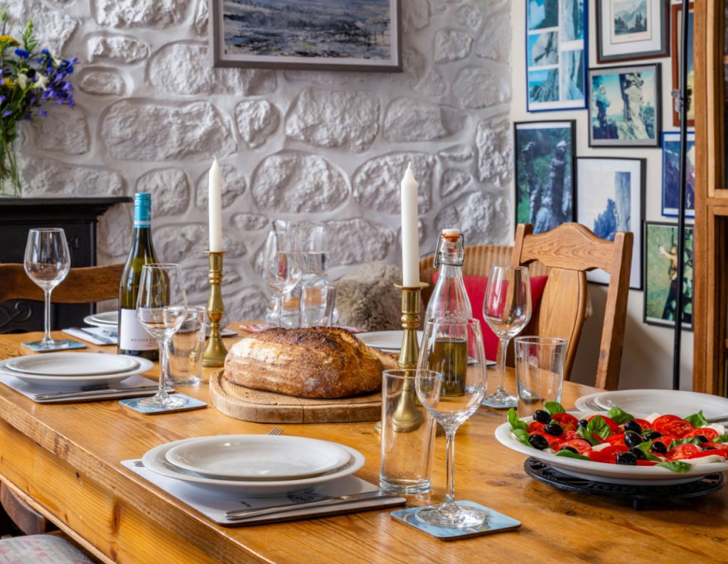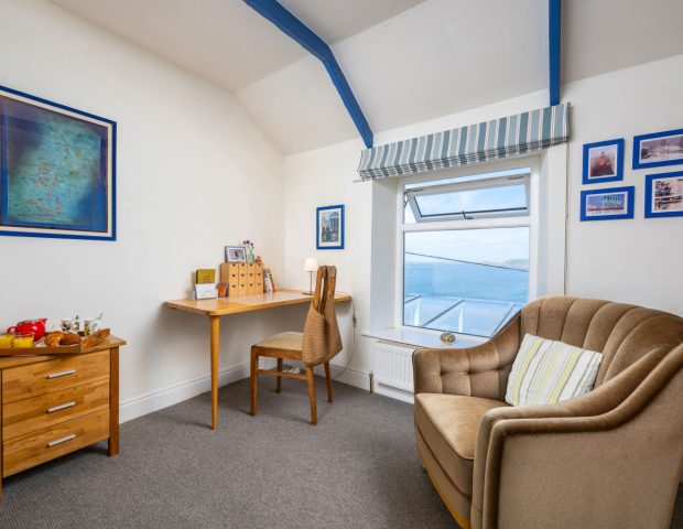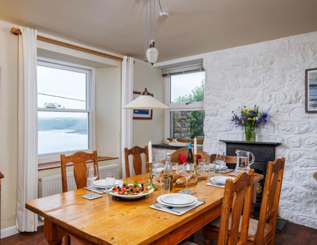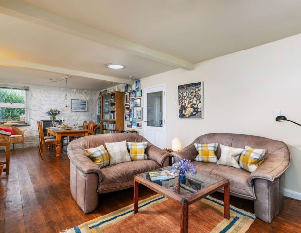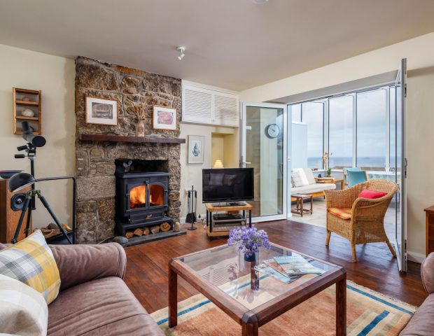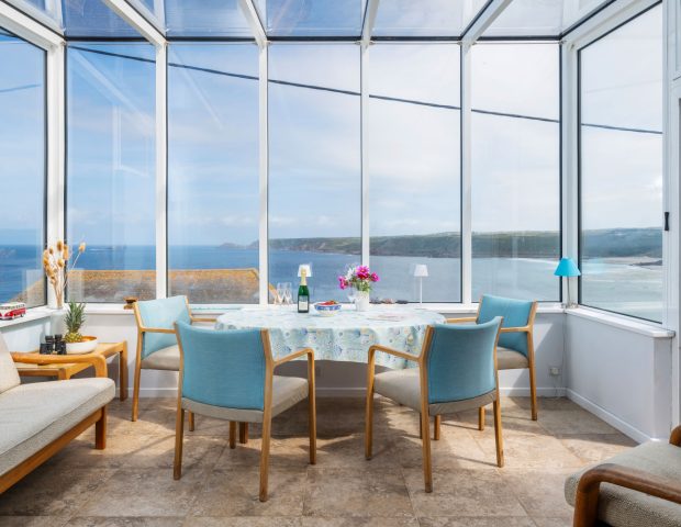 The kitchen is very well equipped and you enter the house into here. It has oven and hob, fridge, freezer, dishwasher and a separate utility area with washing machine. There is outside space for drying clothes or an airer. From the kitchen you lead into the open plan dining and lunge area with large family dining table and views of the ocean and welcoming sofas at the other end encircling the woodburner. The sun room is then off here which provides warmth and light as well as the most breathtaking views.